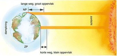 - Geografische Breedteligging: Rond de evenaar is het warm, doordat daar de zon loodrecht op staat. De zon hoeft dus een minder groot stuk land te verwarmen. Hoe verder je van de evenaar af gaat hoe schuiner de zonnestralen op de aarde komen. Hierdoor neemt de temperatuur richting de aardpolen af. Ook bepaalt breedteligging de windrichting en neerslag.